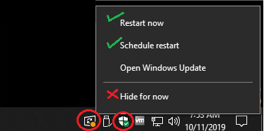 Do not ignore the notifications that pop up on the taskbar!  Windows Update and Security Center notifications are located down by the clock.  If you see the Windows Update notification displayed, left-click on it, and select your restart option to make sure updates are applied.  We do not recommend hiding the notification.  Click on Open Windows Update if you want to view the updates that are being installed.